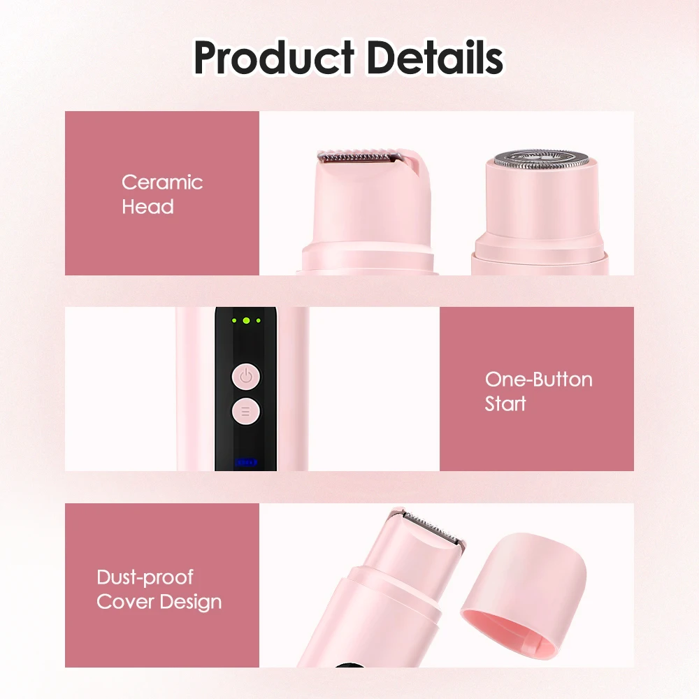 1. The women’s electric razor features a dual-head design for versatile trimming. The short shaving head (0.3-6mm trimming) and smooth shaving head (≈0.3mm precise trimming) are ideal for multiple body areas.